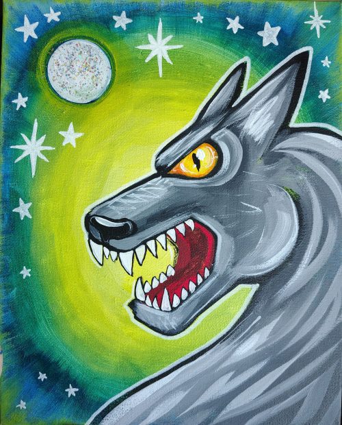 Learn how to paint an awesome, ferocious Werewolf with a glowing background and sparkly moon. This class is only for Parent+children and is limited to 6 groups. One parent can bring up to two children and additional children must be accompanied by another parent or guardian.