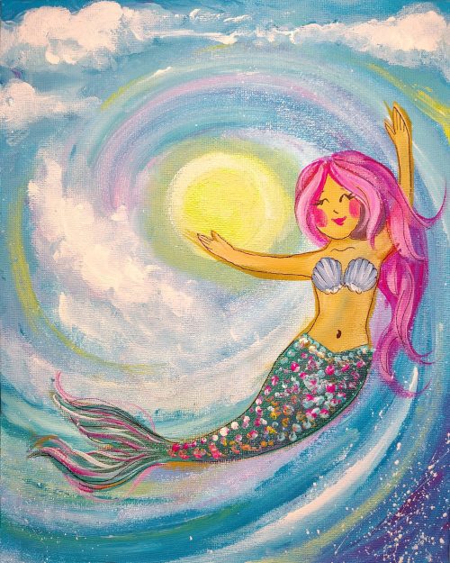 Learn how to paint a beautiful ocean scene and mermaid! This class is only for Parent+children and is limited to 6 groups. One parent can bring up to two children and additional children must be accompanied by another parent or guardian.