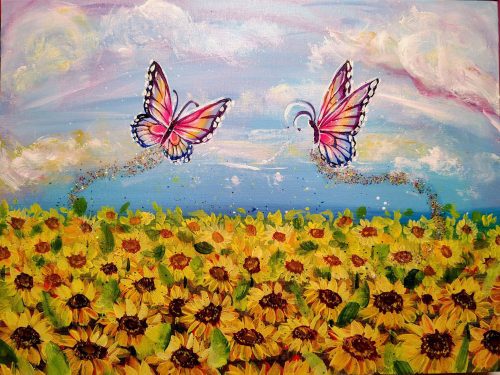 Learn how to paint a beautiful, glowing field of flowers, a colorful, whimsical sky and butterflies in the colors of your choosing, leaving a trail of glitter.